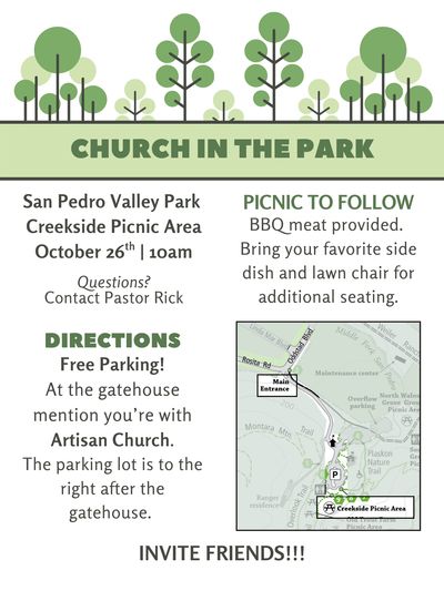 Sunday, October 26th we will be having church in the park! Service will start at 10:00am with worship and a sermon from Pastor Megan. Afterward we'll have a picnic!